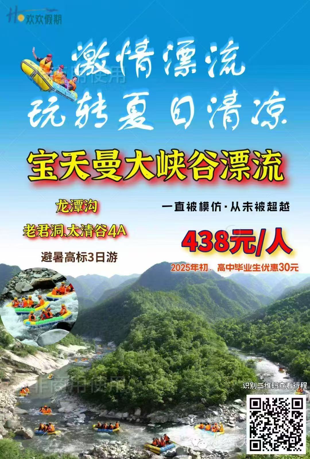 河南--南陽【最好漂流+避暑景區】寶天曼大峽谷漂流4A+老君洞4A+龍潭溝 高品質 3日游