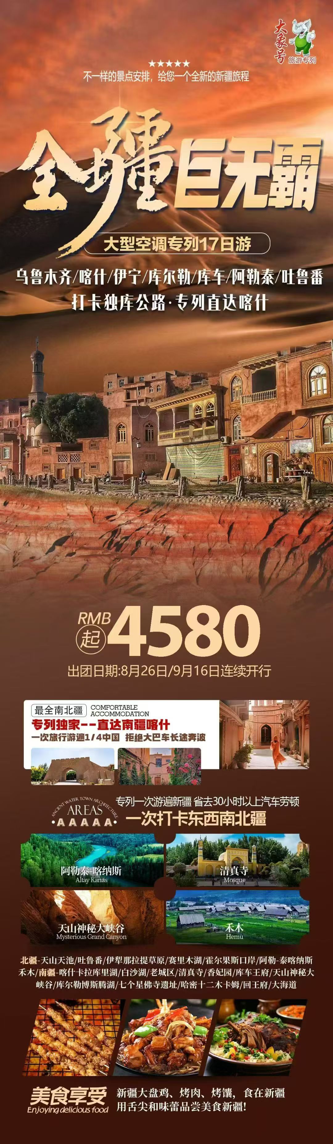 《北疆-天山天池、吐魯番、伊犁那拉提草原、賽里木湖、霍爾果斯口岸,阿勒泰-喀納斯、禾木,南疆-喀什卡拉庫里湖、白沙湖、老城區(qū)、清真寺、香妃園、庫車王府、天山神秘大峽谷、庫爾勒博斯騰湖、七個星佛寺遺址、哈密十二木卡姆、回王府、大海道,空調(diào)專列17日游》