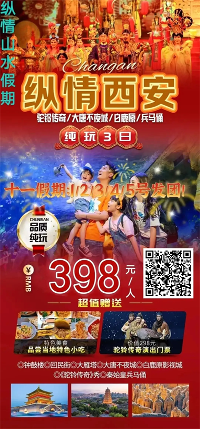陜西--【縱情西安】398元無必消丨贈(zèng)送演出丨西安兵馬俑+大唐不夜城+白鹿原三日游