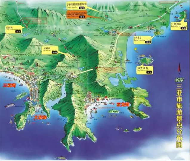● 大牌景區:蜈支洲4A、分界洲5A、南山5A、呀諾達5A、千古情景區、天涯4A、椰田