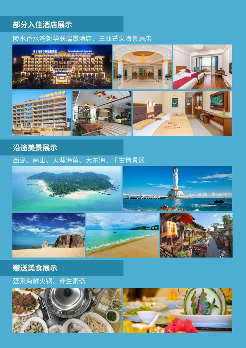 一價全包,絕不推薦白天自費(fèi)景點(diǎn)和晚間娛樂項目(千古情表演和潛水除外) 絕不增加行程以外購物店:消費(fèi)透明,暢行無憂 絕不更換行程所含景點(diǎn):不可抗力因素除外:如臺風(fēng)、暴雨、國家政策,戰(zhàn)爭等 絕不壓縮游覽時間:保證足夠的游覽時間,深度享感受海島風(fēng)光,好好和大海親密接觸 |