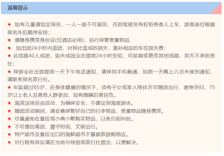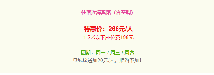聲明:1、本網(wǎng)站上的旅游線路和價(jià)格僅供參考,具體價(jià)格及發(fā)團(tuán)時(shí)間請(qǐng)依電話或到店咨詢?yōu)闇?zhǔn),網(wǎng)購(gòu)預(yù)定用戶以工作人員回復(fù)確認(rèn)為準(zhǔn)! 2、本公司不接受因價(jià)格差異引發(fā)的一切訴求! |