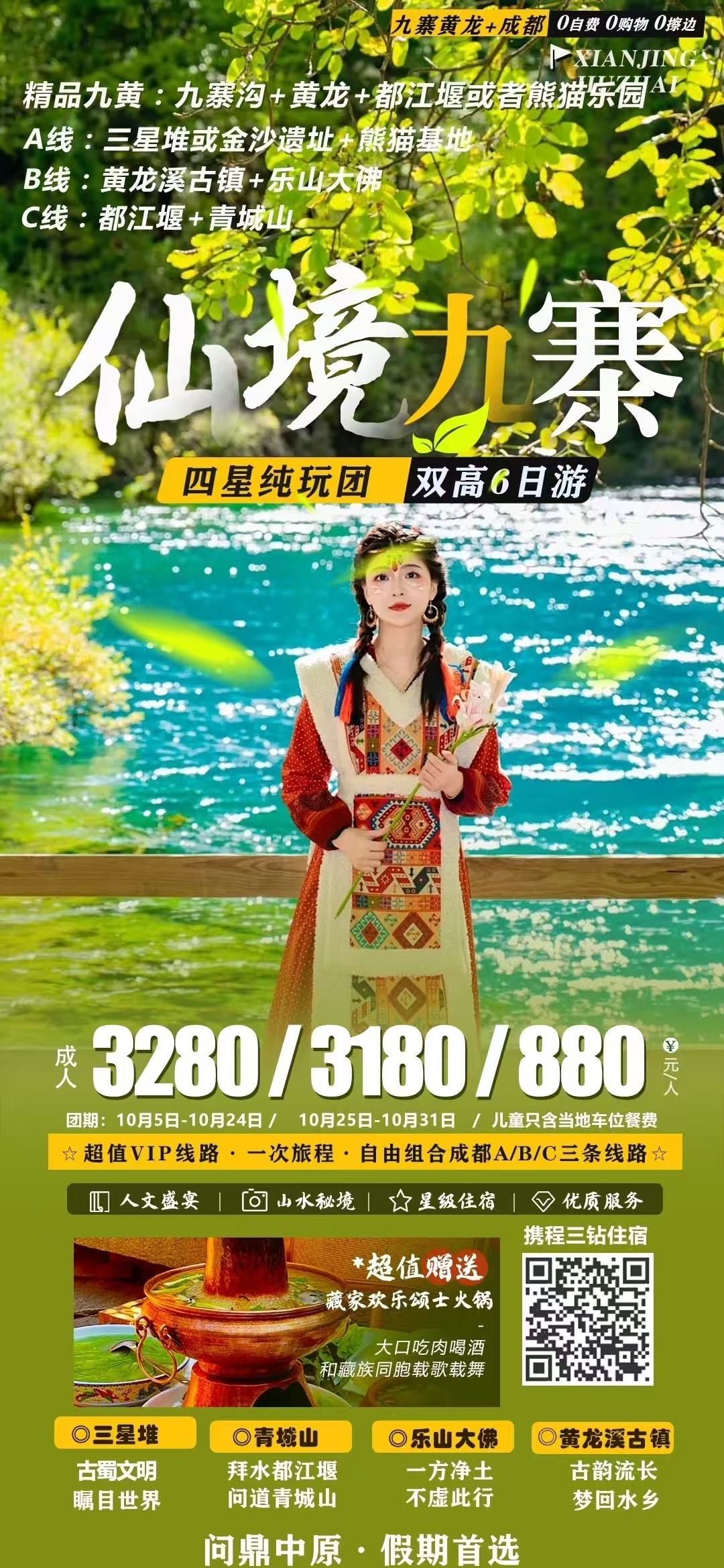 四川--【仙境九寨】(九寨溝/黃龍/熊貓樂園/都江堰+成都A/B/C線純玩雙高6日游