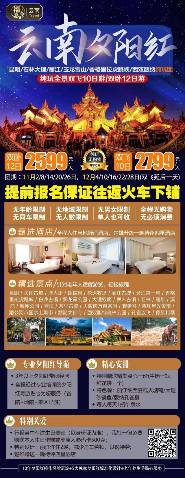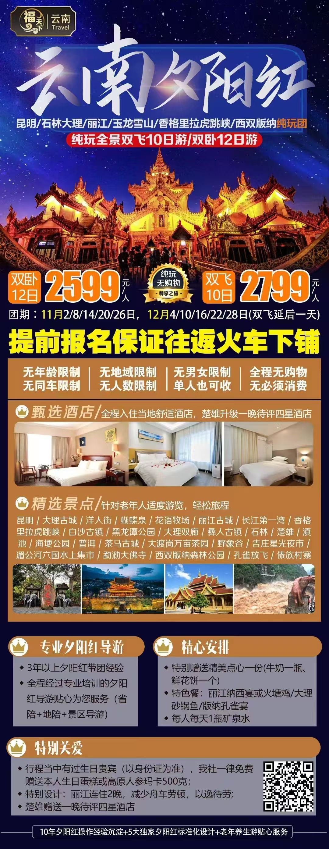 云南--昆明大理麗江版納夕陽紅雙臥12日/雙飛10日